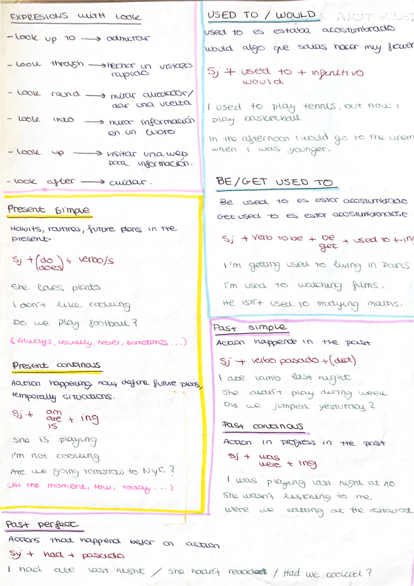 present simple, present continuous, past perfect, past simple, past continuous, used to, would y be/get used to