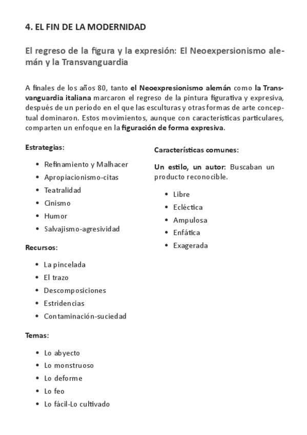 El regreso de la figura y la expresión: El Neoexpersionismo alemán y la Transvanguardia. Origen, Contexto, Características, Diferencias entre EEUU y Europa. Postmodernidad en EEUU. Neoexpresionismo aleán. Antecedentes, características y representantes.