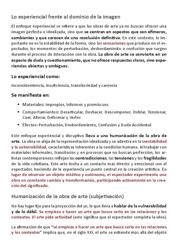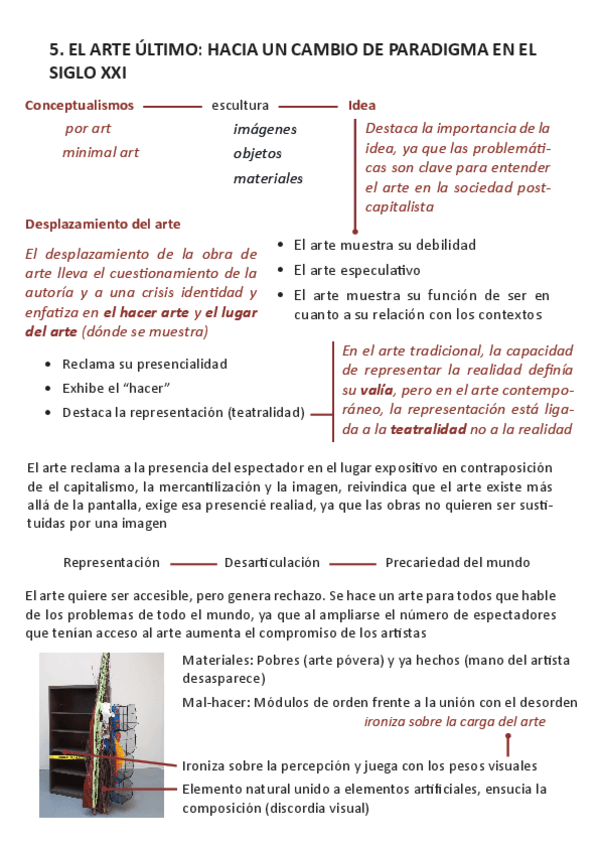 Conceptos del tema 5 desarrollados: Contexto, Precariedad en el arte, Humanización de la obra de arte (subjetivación), La autoreferencialidad, Desplazamiento del arte).
