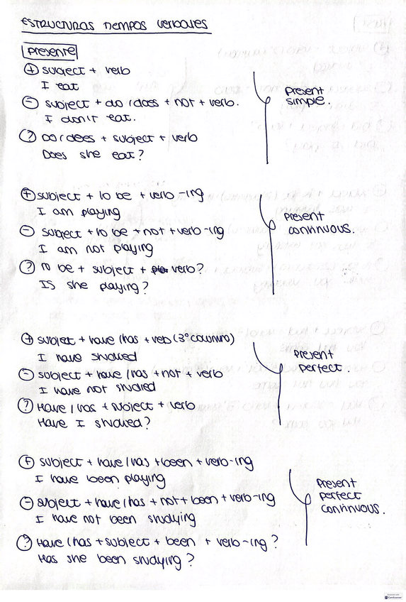 Aprende y estudia los tiempos verbales. Organizados en tres documentos: el primero, con las estructuras; el segundo, que explica los usos y; el tercero, que organiza las "keywords" para que puedas identificar el tiempo verbal de forma más fácil.