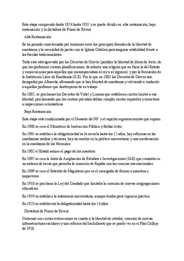 Políticas educativas de la Restauración, pasando por la Alta Restauración, Baja Restauración y la Dictadura de Primo de Rivera.