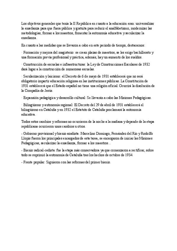 Objetivos generales, medidas reformistas y reformas educativas según la etapa de la II República.