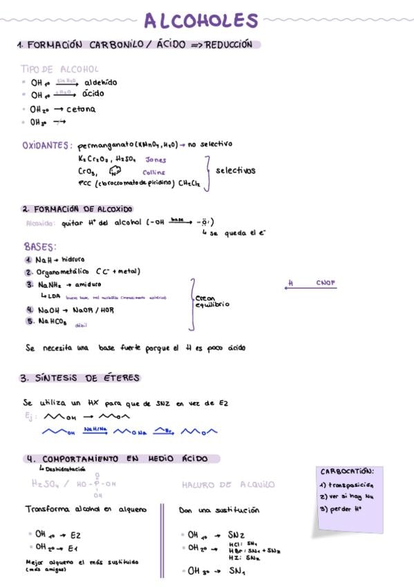 Son apuntes resumidos de alcoholes con lo necesario para hacer reacciones. Estuve con Almudena Perona pero sirven para todos los profesores, porque las reacciones son las mismas.
