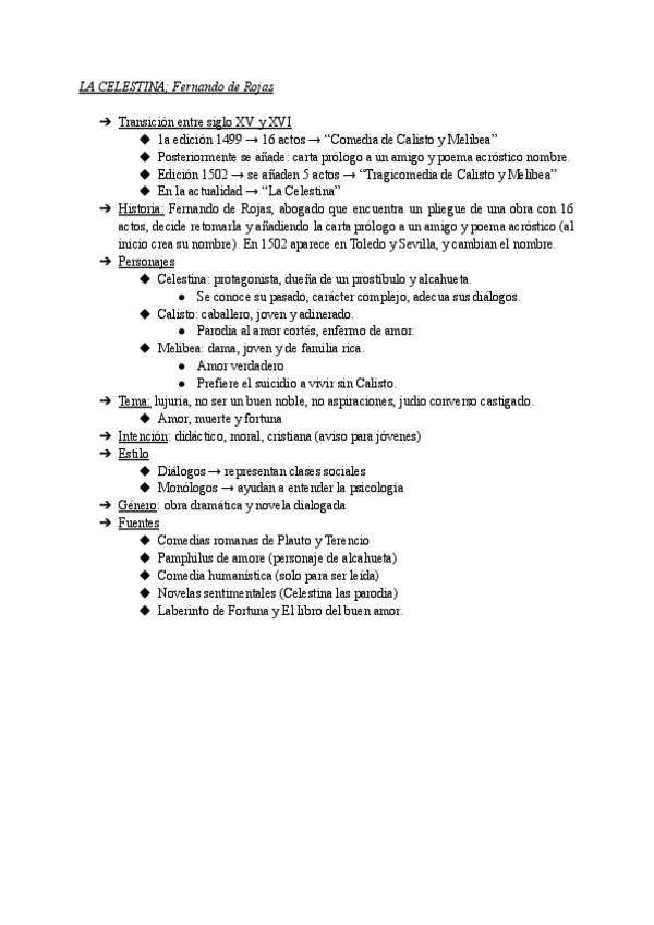Apuntes para examen parcial de castellano (primero de bachillerato de las Islas Baleares) sobre: La Celestina, Fernando de Rojas; El Lazarillo de Tormes, anónimo y El Quijote, Miguel Cervantes de Saavedra. Saqué un sobresaliente con este resumen!!!