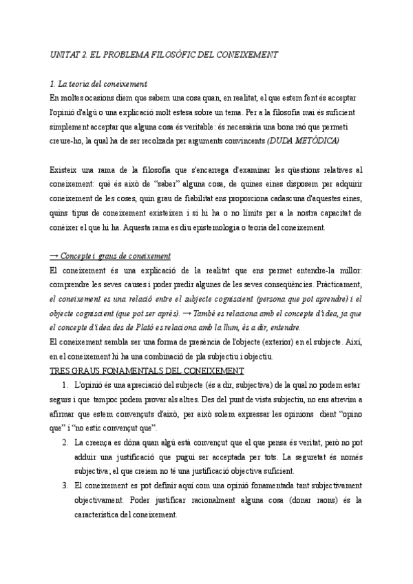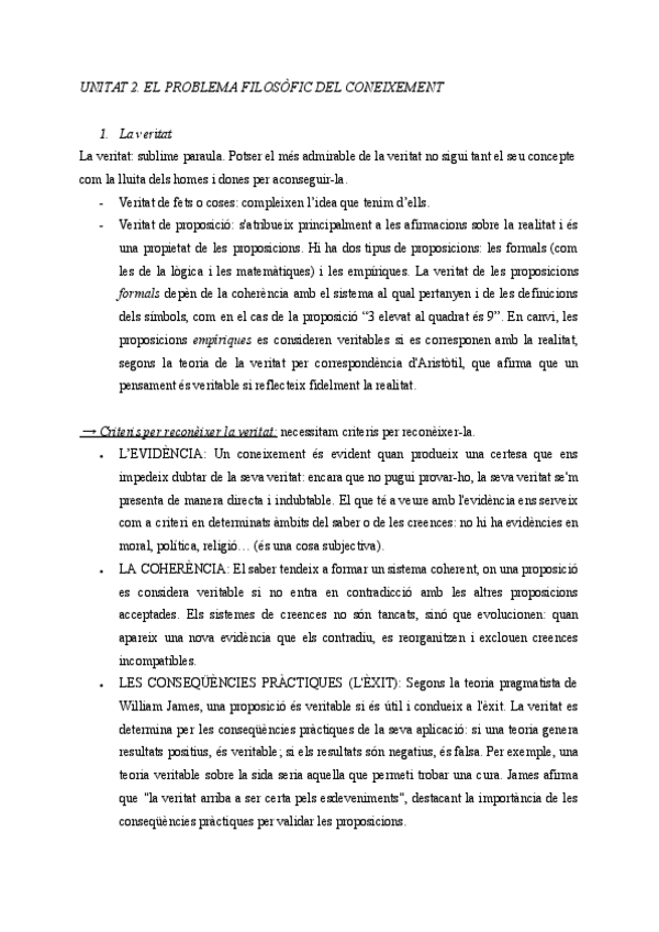 Resumen apuntes de la unidad dos de filosofía de primero de bachillerato (Islas Baleares). Trata: la veritat i els límits dels coneixements (la verdad y los límites del conocimiento.