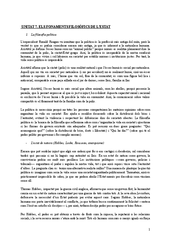 Resumen apuntes unidad 7 de filosofía de primero de bachillerato (Islas Baleares) sobre: ELS FONAMENTS FILOSÒFICS DE L'ESTAT (filosofia política)