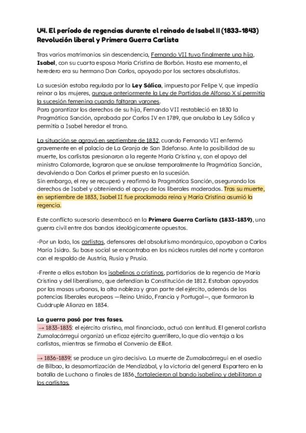 U4 . El período de regencias durante el reinado de Isabel II (1833-1843) Revolución liberal y Primera Guerra Carlista
