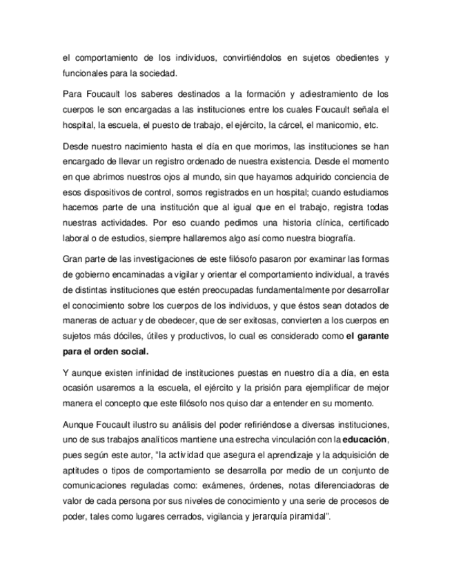 Ensayo sobre el concepto de cuerpos dóciles de acuerdo con Michel Foucault, en el que se usan la escuela, el ejército y la prisión para una mejor ejemplificación
