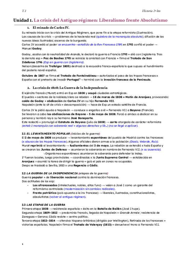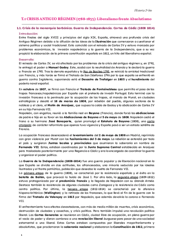 Resúmenes ampliados T.1 historia: La crisis del antiguo régimen: liberalismo frente a absolutismo.