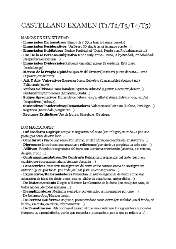 APUNTES PARA EXAMEN DE CASTELLANO TEMAS 1, 2, 3, 4 Y 5. MARCAS DE SUBJETIVIDAD, LOS MARCADORES, Estructura Interna, externa. SINÓNIMOS, RECURSOS ESTILÍSTICOS, FUNCIONES DEL LENGUAJE, LA SUSTITUCIÓN, LOS CONECTORES, MECANISMOS DE COHESIÓN YCAMPO SEMÁNTIC