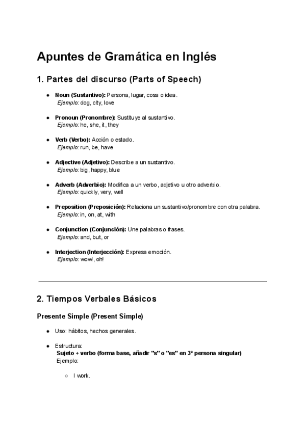 Estos apuntes son los conceptos básicos de gramática en inglés.las partes del discurso (como sustantivos, verbos y adjetivos), tiempos verbales (presente, pasado y futuro), el uso de artículos, los pronombres personales y preguntas y negaciones.