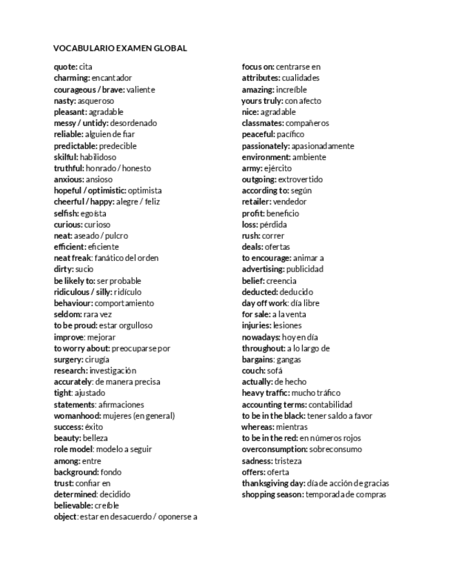 Listado de vocabulario de inglés para 3º o 4º de la eso con traducciones al español.