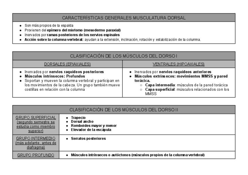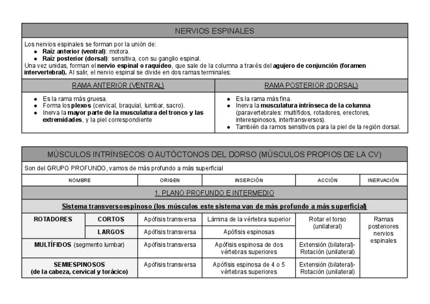 Resumen de todos los músculos del tronco (temas del primer semestre) en tablas con origen, inserción, función e inervación (y vascularización). También incluye pequeñas explicaciones de las estructuras estudiadas en clase :)