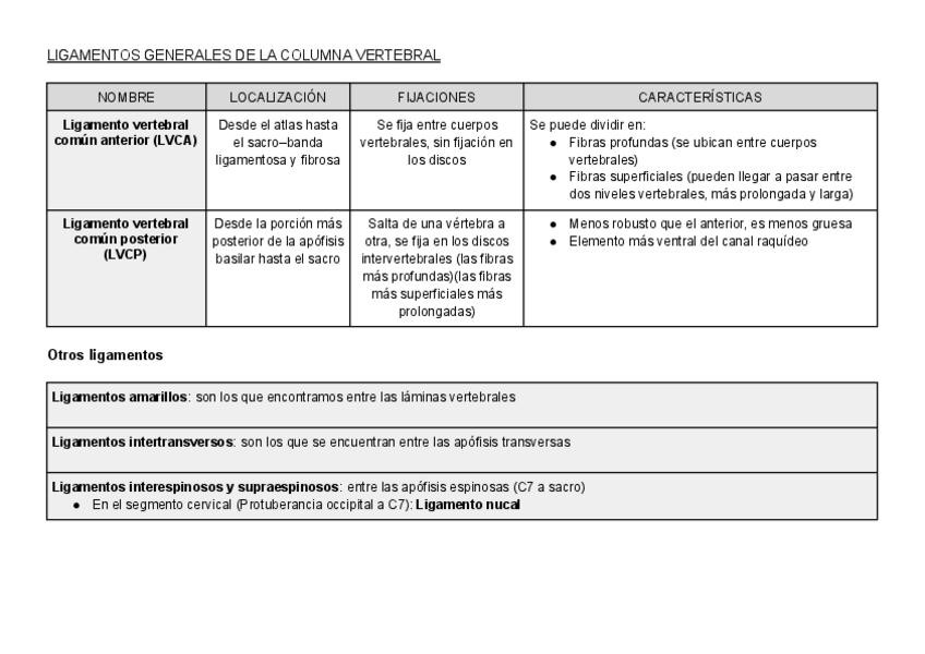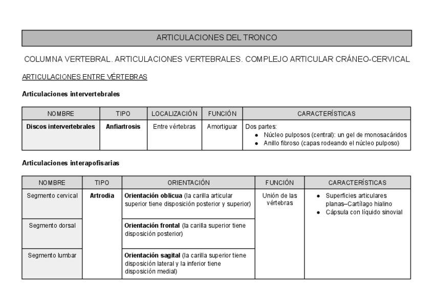 Resumen de las articulaciones del tronco y cabeza (primer semestre) en tablas con breves explicaciones