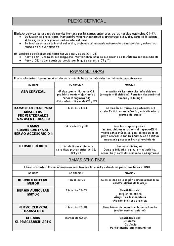 Resumen del plexo cervical (primer semestre), es un solo folio