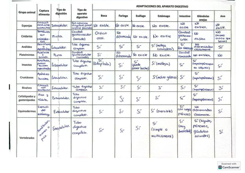 Tablas completas y resueltas de anatomía comparada (Nutrición en Animales).