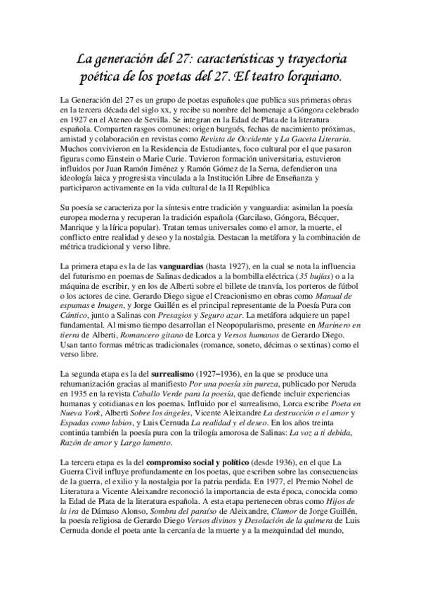 5. La generación del 27 características y trayectoria poética de los poetas del 27. El teatro lorquiano.