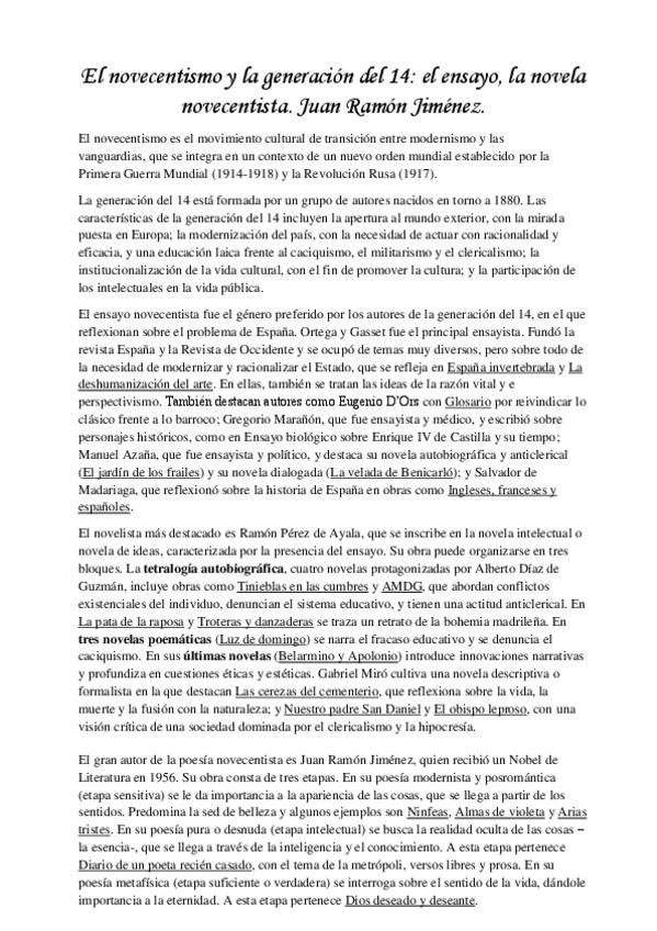 3. El novecentismo y la generación del 14 el ensayo, la novela novecentista. Juan Ramón Jiménez