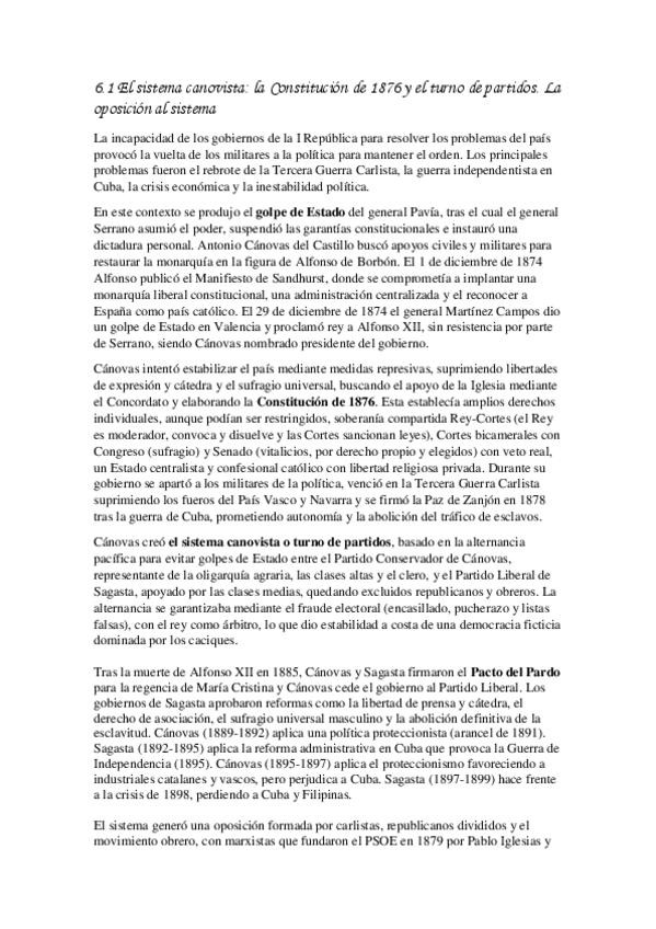 6.1 El sistema canovista: la Constitución de 1876 y el turno de partidos. La oposición al sistema