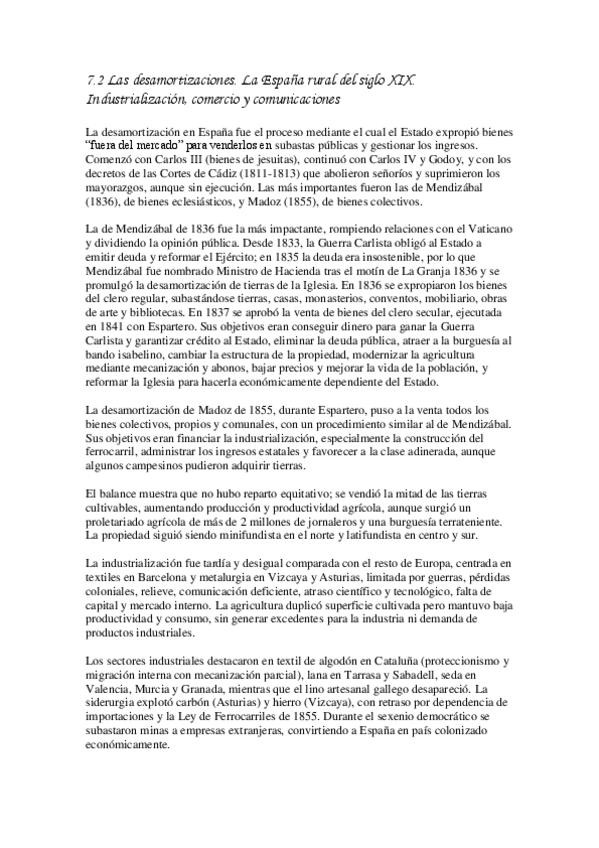 7.2 Las desamortizaciones. La España rural del siglo XIX. Industrialización, comercio y comunicaciones