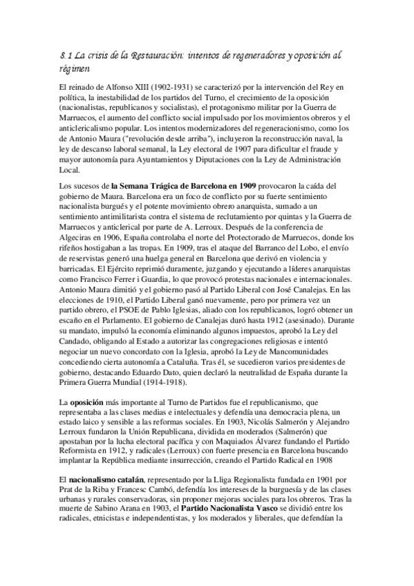 8.1 La crisis de la Restauración: intentos de regeneradores y oposición al régimen