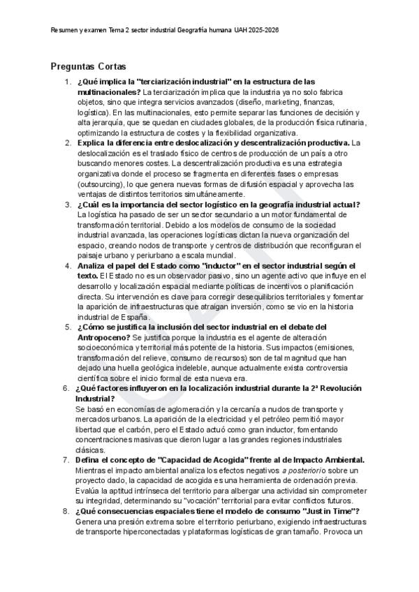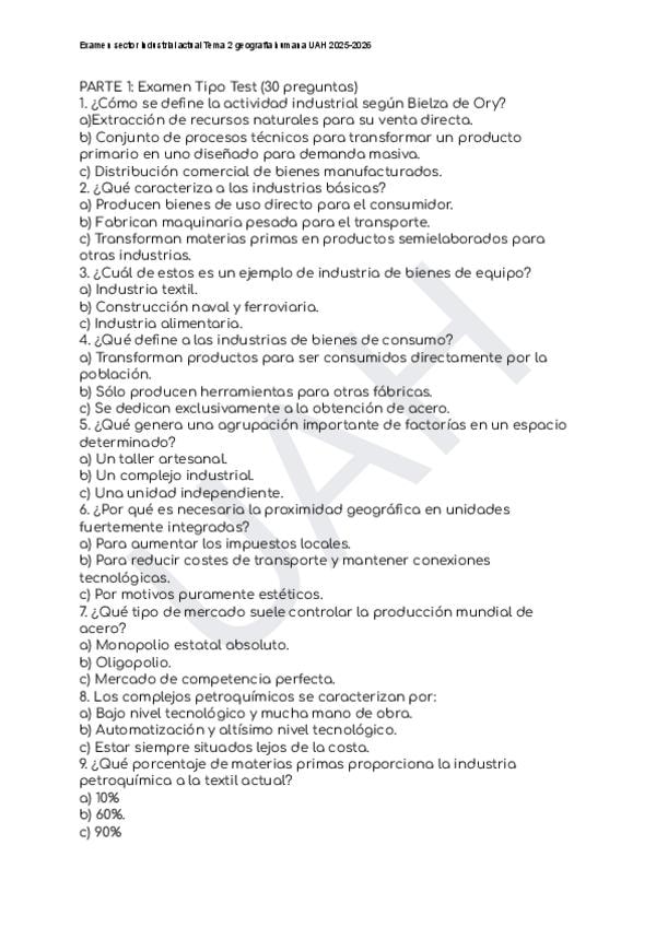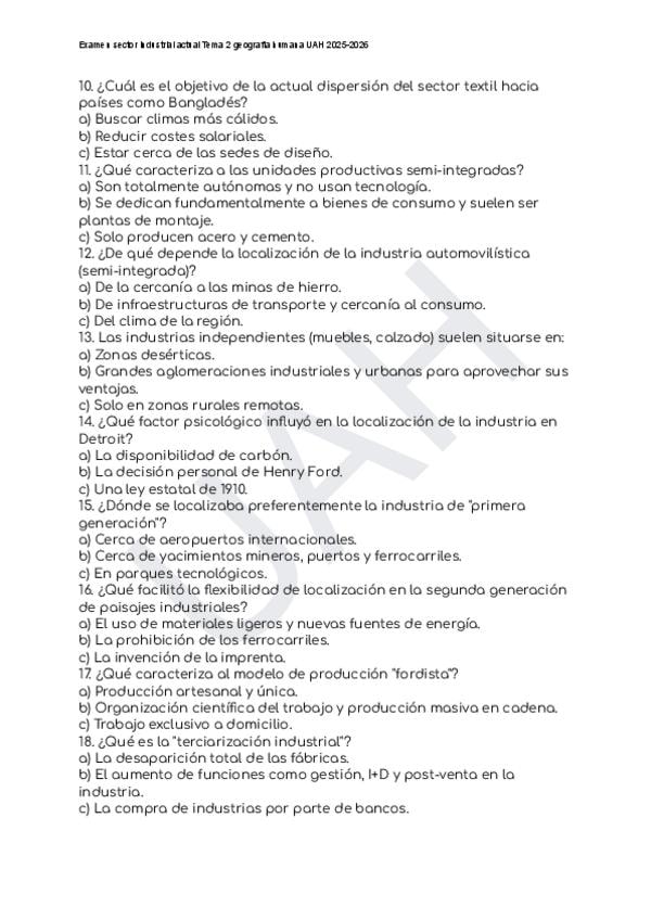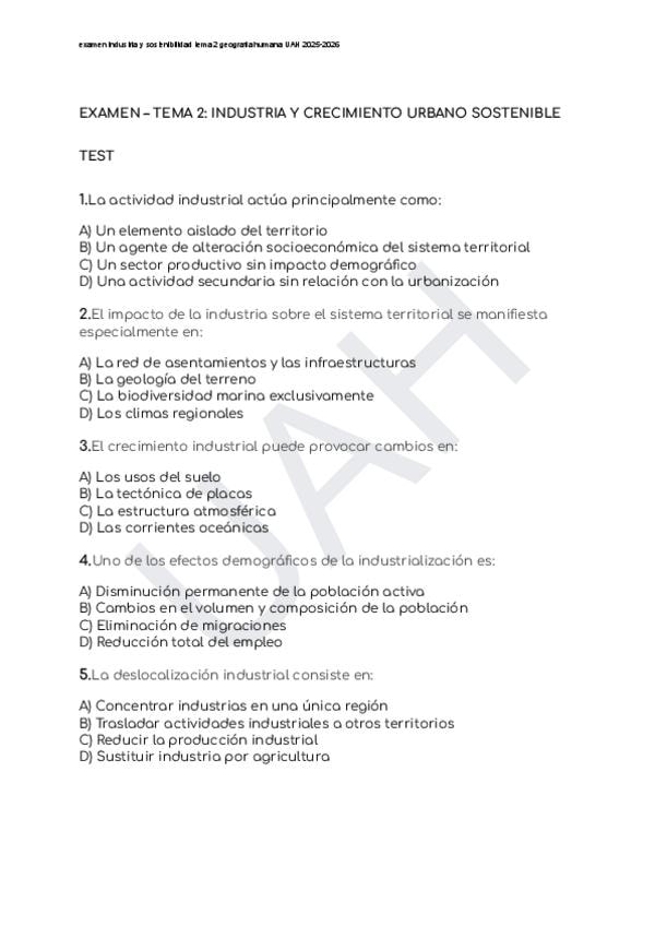 Examen Industria sostenible Tema 2 Geografía Humana UAH 2025-2026