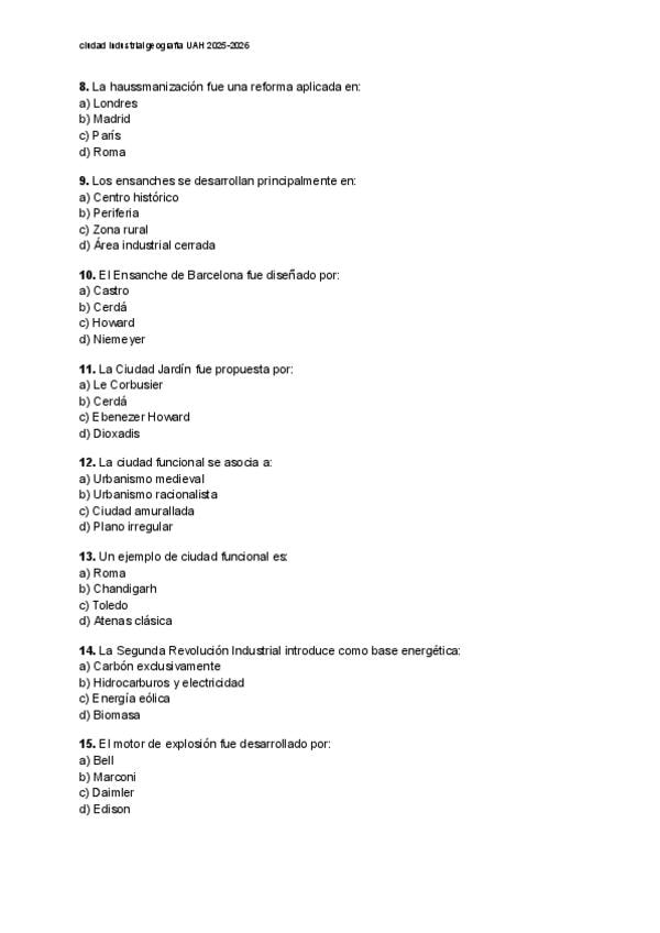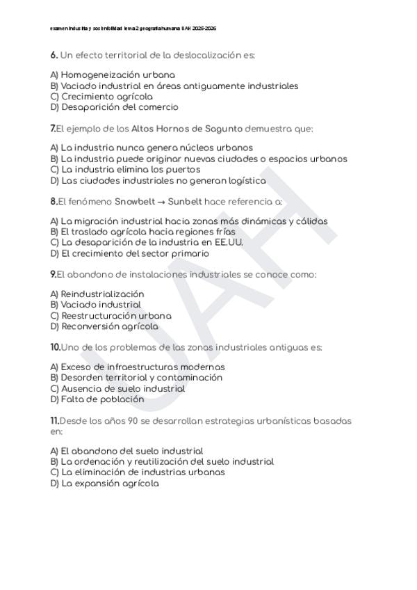 examen la ciudad industrial Tema 1 Geografía Humana UAH 2025-2026