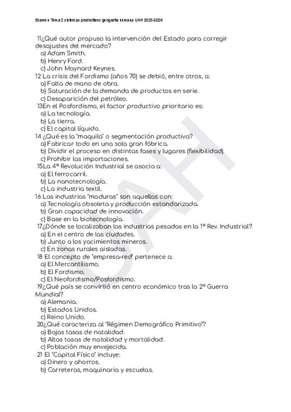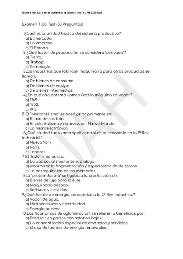Examen sistema productivo Tema 2 Geografía Humana UAH 2025-2026