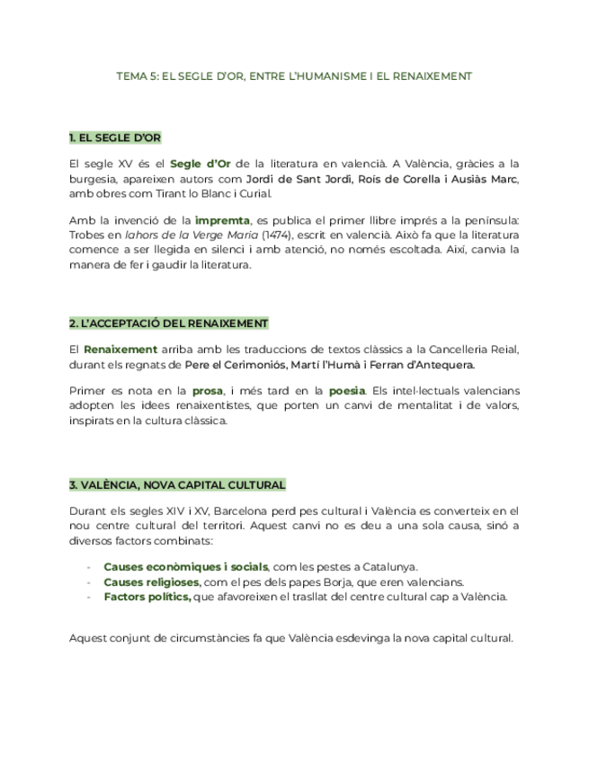 Valenciano resumen unidad 5: EL SEGLE D’OR, ENTRE L’HUMANISME I EL RENAIXEMENT