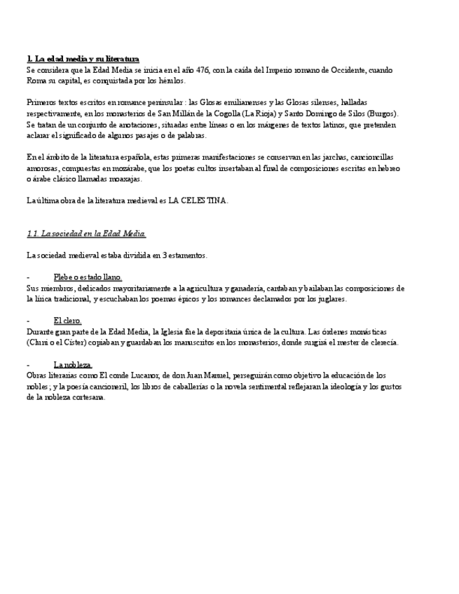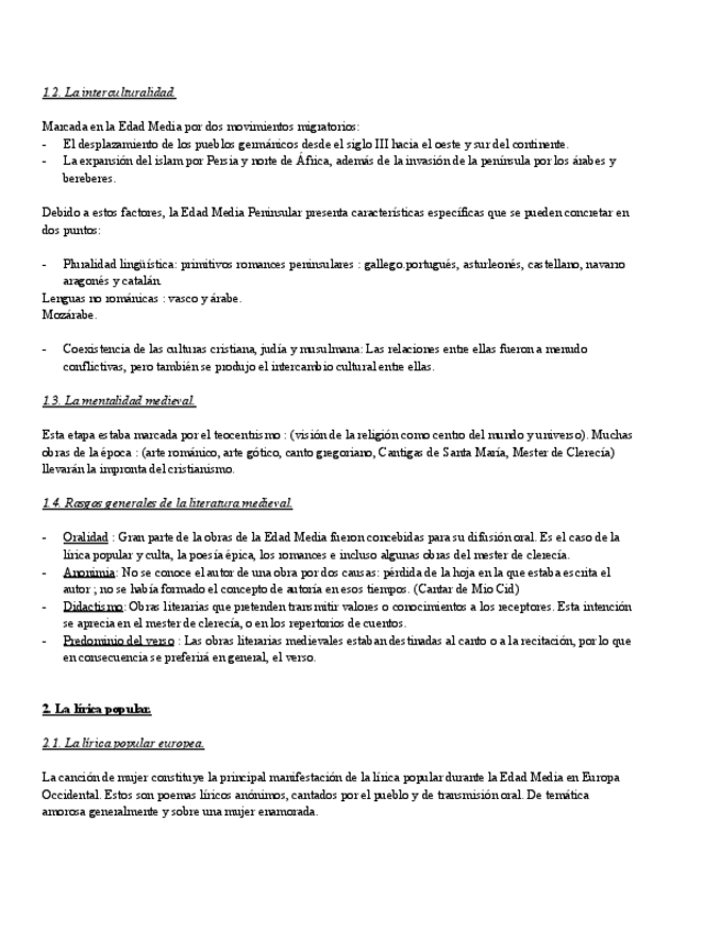 Resumen completo sobre la literatura en la edad media, para la asignatura de lengua de 1º de bachillerato. Incluye: lírica popular/tradicional, lírica culta y sus principales autores y obras, épica medieval (Cantar de Mio Cid) y romances. Perfecto para