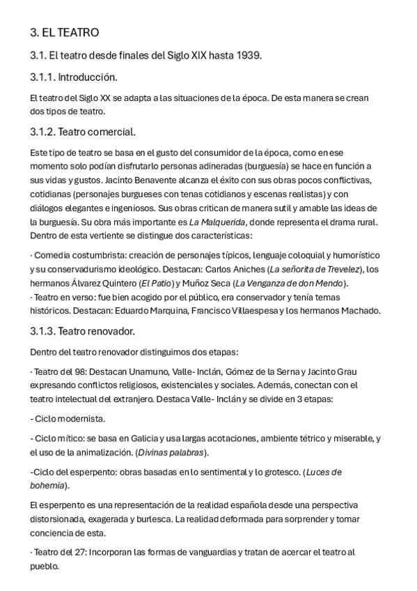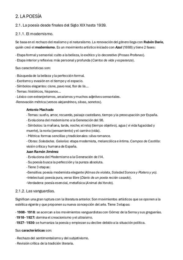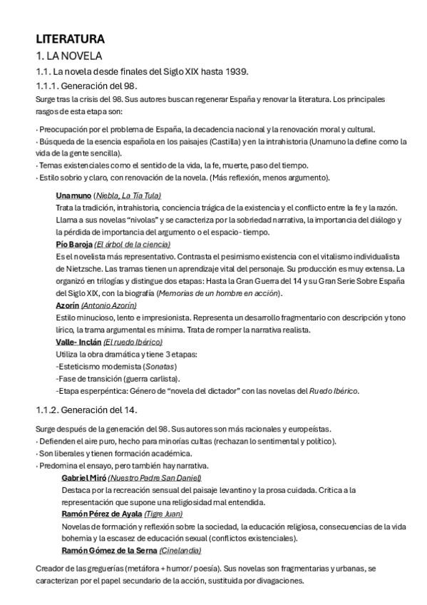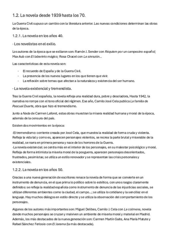 Narrativa, poesia y teatro anterior a 1939; novela y teatro de 1939 a 1970 (incluidos modernismo, todas las generaciones, las sinsombrero...)