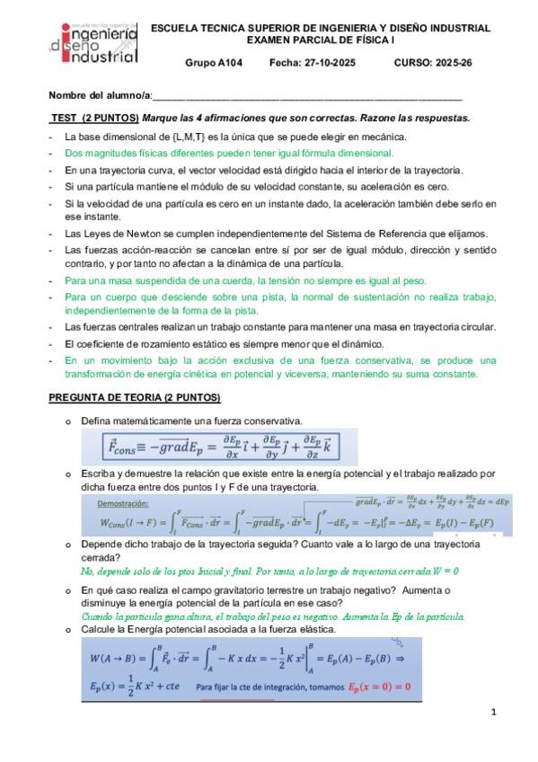EXAMEN PARCIAL A-104 FISICA I CON SOLUCIONES 2025-26