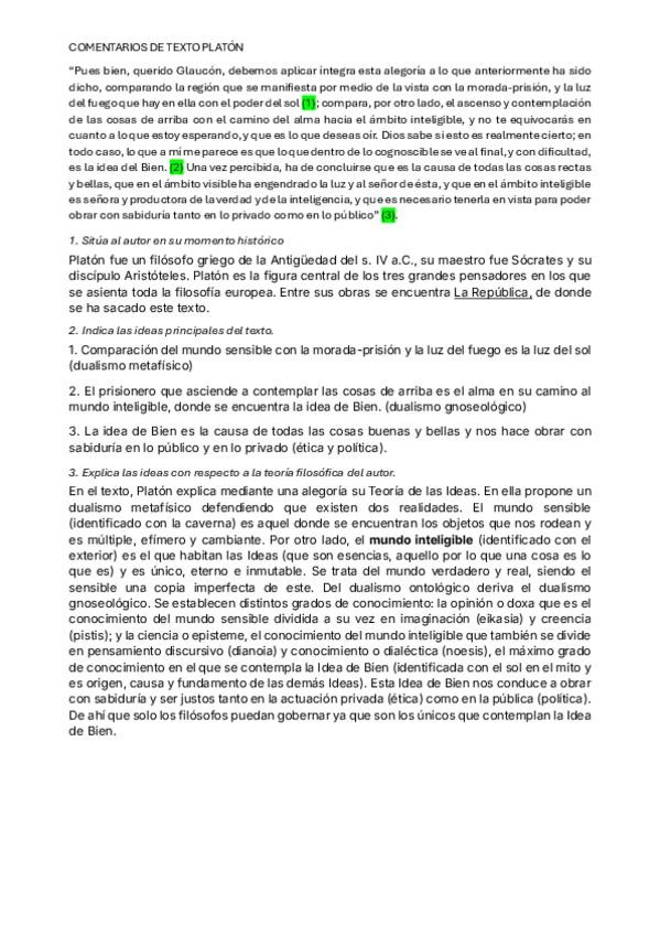 Comentario de texto con selección de ideas principales, situación del autor en su momento histórico y explicación de las ideas en relación a la teoría del autor. Texto: "Pues bien querido Glaucón..." Mito de la caverna de Platón