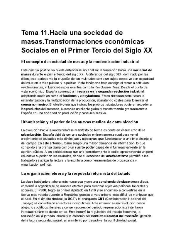 Tema 11.Hacia una sociedad de masas.Transformaciones económicas sociales en el primer tercio del siglo xx,resumen detallado y claro para estudiar pau.