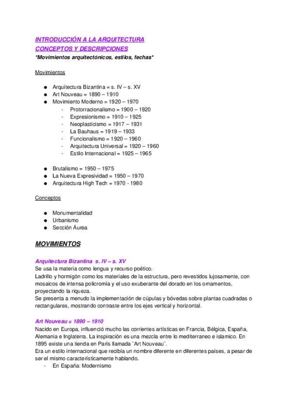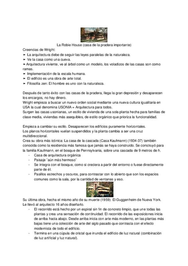 Resumen de los movimeintos arquitectónicos más importantes del primer cuatrimestre, sin estar organizados por tema. Hecho en orden cronológico para entender su sitio en la historia. Hecho para responder las preguntas de desarrollo de los examenes.