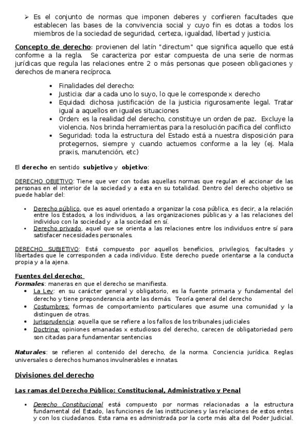 El texto aborda el Derecho Constitucional y el Derecho Público, explica el origen del constitucionalismo y desarrolla conceptos clave como Estado, Constitución, División de Poderes, Derechos y Garantías. Incluyen la evolución hacia el Estado social de de