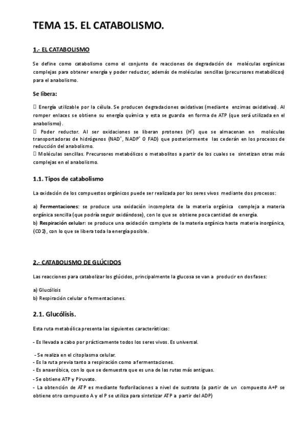 EL catabolismo. Tipos de catabolismo. Glucólisis, respiración aeróbea, ciclo de Krebs, fosforilación oxidativa, fermentaciones, catabolismo de lípidos, beta oxidación de los ácidos grasos, catabolismo de proteínas, catabolismo de ácidos nucleicos