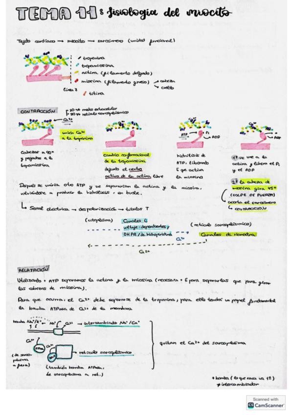 Apuntes esquemáticos de Fisiología del miocito de la asignatura de Fisiología General. Útiles para estudiantes de primer curso.