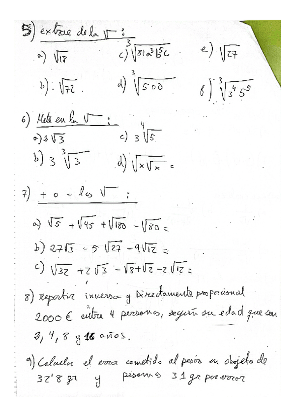 Son ejercicios de matemáticas, de raíces, potencias, etc... Las dos primeras hojas son los ejercicios en sí, y las demás hojas son los ejercicios resueltos