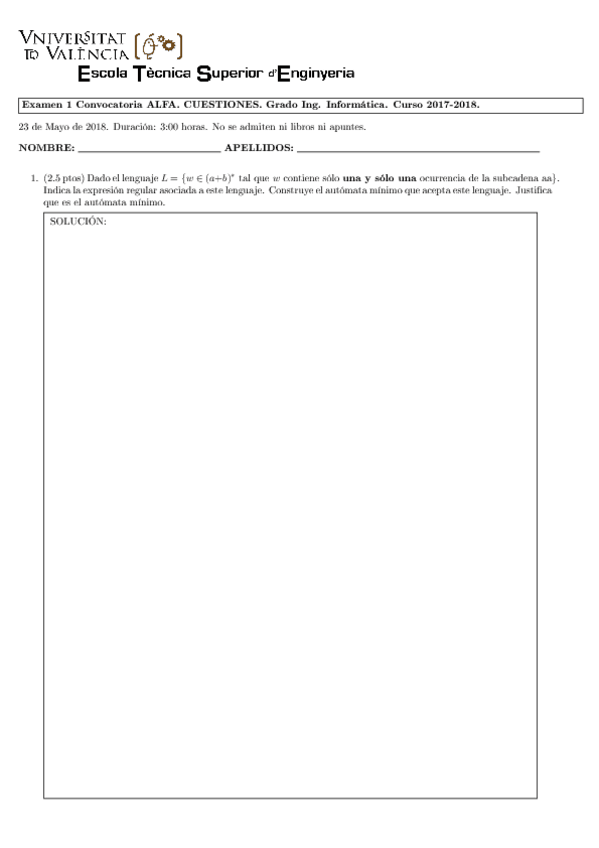 He publicado nuevos examenes de 2º Autómatas, Lenguajes Formales y Aplicaciones: Examenes
