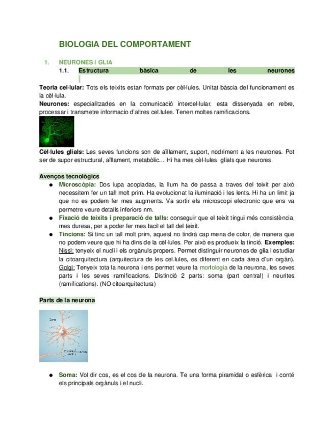 Apuntes de biologia TEMA 1_ Neurones i glia. BIOLOGIA DEL COMPORTAMENT