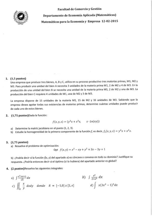 He publicado nuevos examenes de 1º Matemáticas para la Economía y la Empresa: Examen-Febrero-2015-Resuelto.pdf