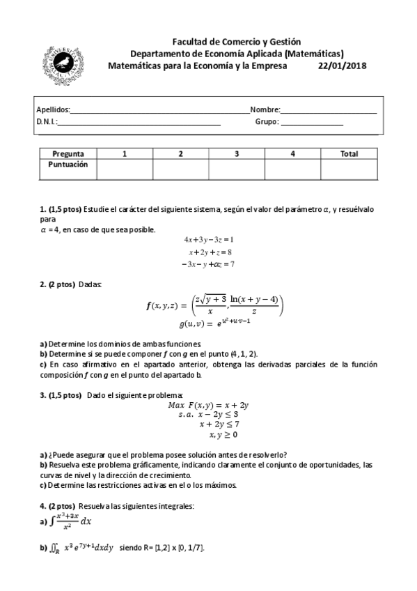 He publicado nuevos examenes de 1º Matemáticas para la Economía y la Empresa: Examen-Febrero-2018-Resuelto.pdf