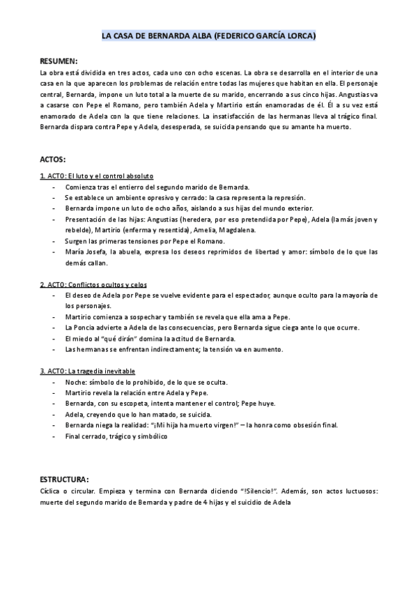 LA CASA DE BERNARDA ALBA (FEDERICO GARCÍA LORCA). Resumen para selectividad