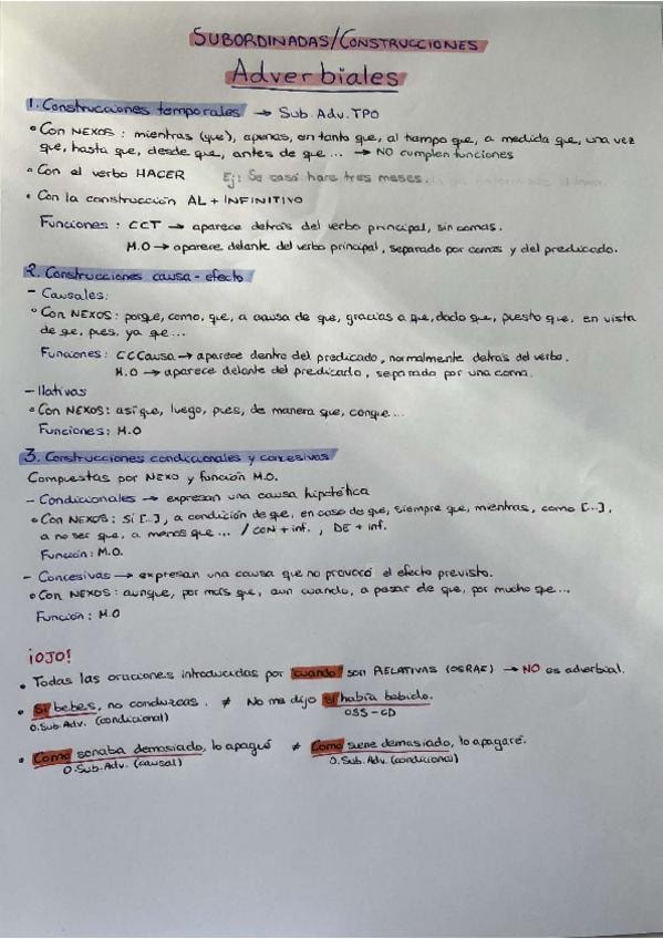 Oraciones subordinadas y construcciones adverbiales: Construcciones temporales, de causa-efecto y condicionales y concesivas.