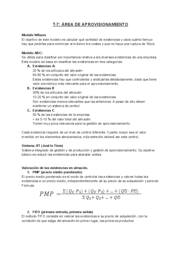 Modelo Wilson: Modelo ABC: Sistema JIT PMP (precio medio ponderado) FIFO (primera entrada, primera salida)