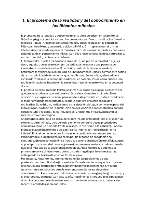 El problema de la realidad y del conocimiento en los filósofos milesios para segundo de bachillerato