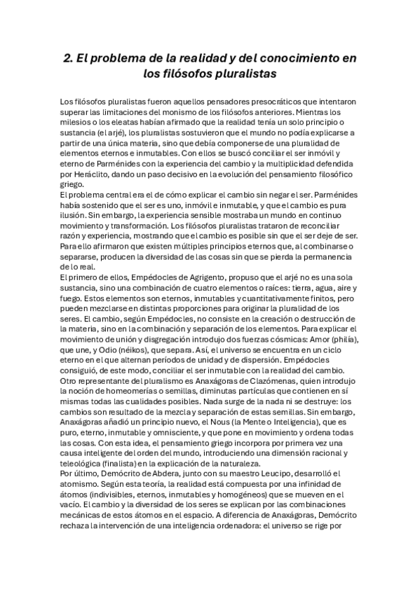 El problema de la realidad y del conocimiento en los filósofos pluralistas para 2º bachillerato