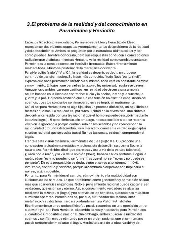 El problema de la realidad y del conocimiento en Parménides y Heráclito para segundo de bachillerato