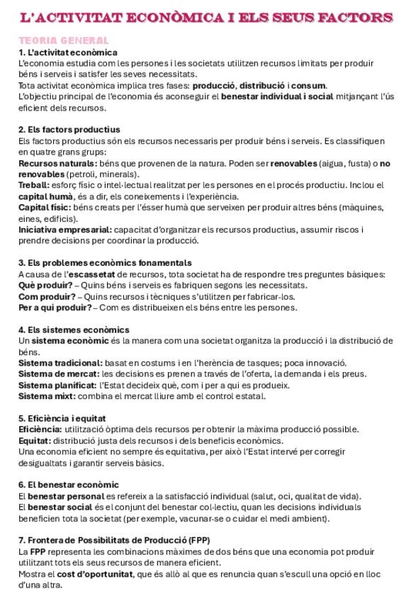 apunts de economía del tema ''L’activitat econòmica i els seus factors'',esta en català